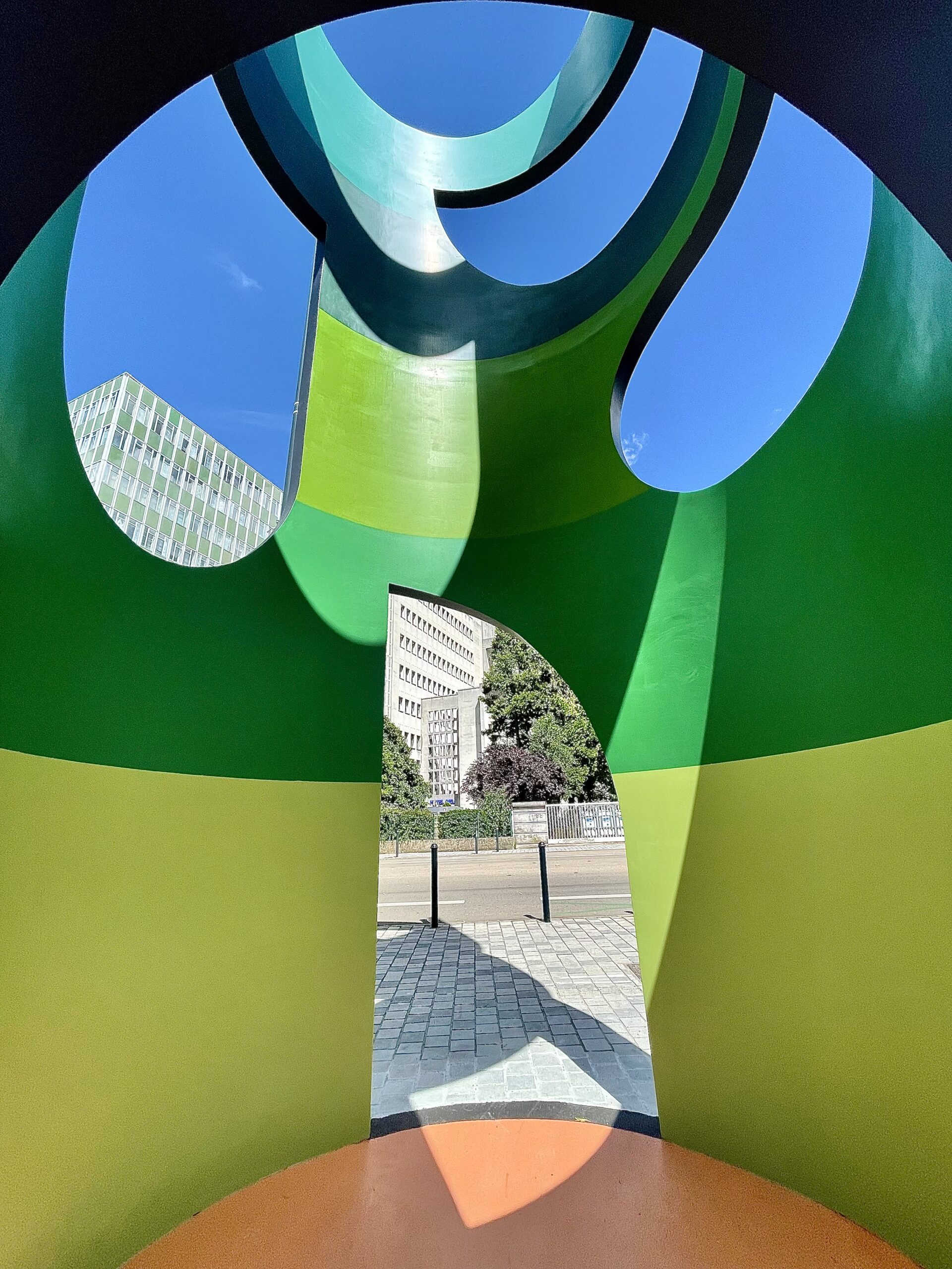These existing features and the orange colour found on the wall fragment were the departing point for the conception of this work. The ‘new’ and the ‘old’ share the same visual language of geometrical shapes, and a palette made of orange and contrasting greens.