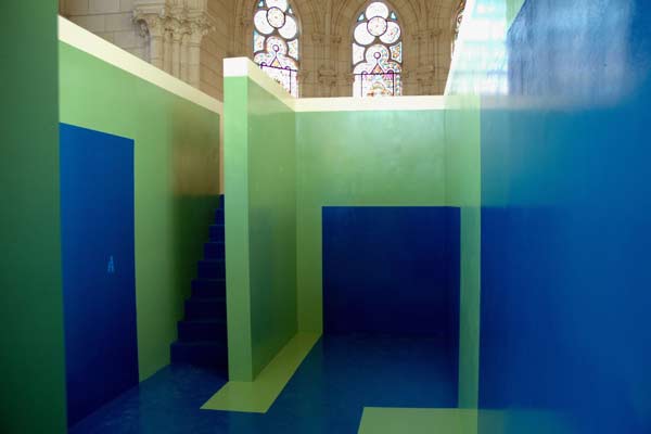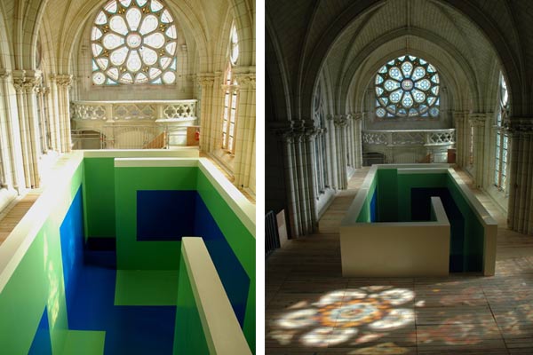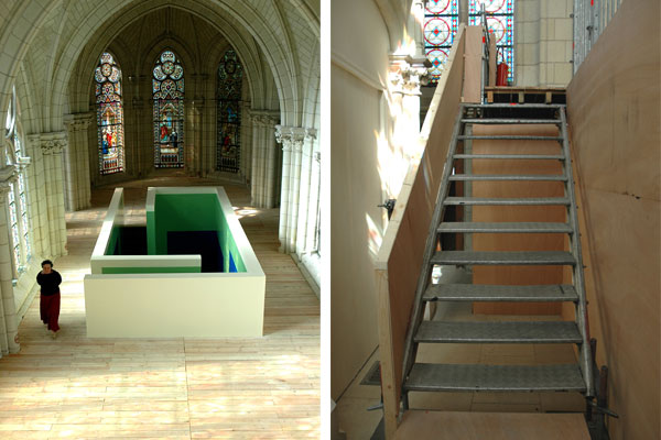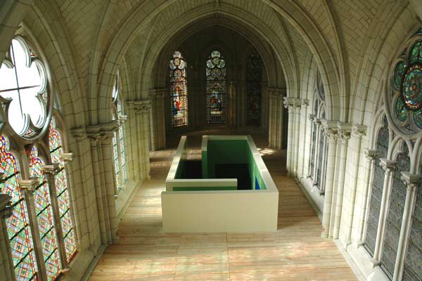 Elevated floor, lower chamberFloor 19,5 x 10m, Room 7 x 3 x 3m high, Level floor 2,5mOrganised by: Services Arts Plastiques de la Ville de Thouars, Jean-Luc Dorschies
